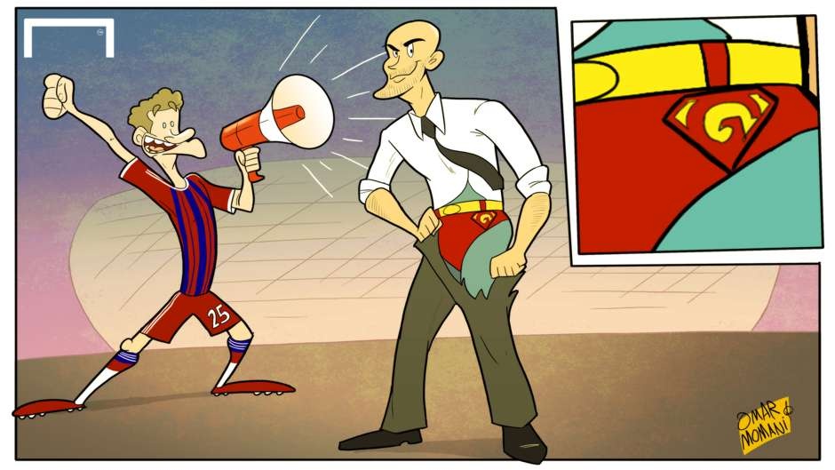 | Sau khi Bayern đánh bại Porto 6-1 ở tứ kết lượt về Champions League ngày 22/4, tiền đạo Thomas Mueller đã ví HLV Pep Guardiola là siêu nhân. Ở trận này, chiến lược gia người Tây Ban Nha mải ăn mừng bàn thắng mà không biết quần mình bị rách từ bao giờ. Bayern của Pep đoạt vé vào bán kết nhờ thắng 7-4 sau hai lượt trận (lượt đi thua 1-3). |