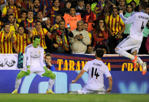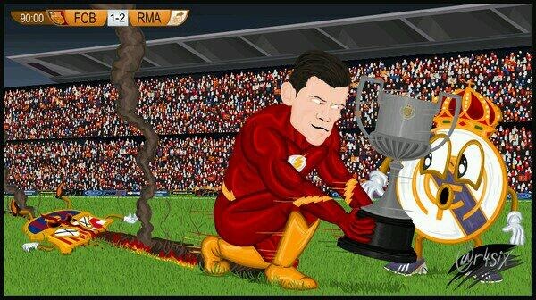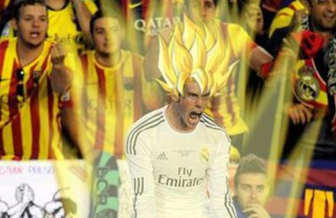 | Sau màn trình diễn không tưởng trong trận gặp Barca, Bale được người hâm mộ ví như siêu nhân hạ gục Barca mang cúp về cho Real. |