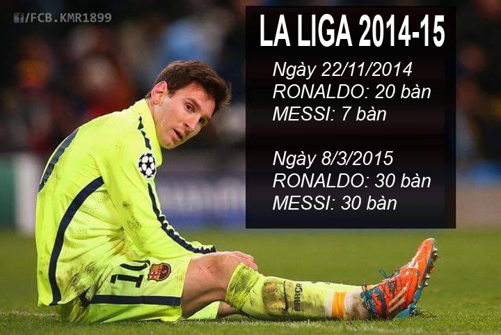 | Trong cuộc tiếp đón Vallecano tại Nou Camp diễn ra sau đó 18 tiếng, Messi lập hat-trick góp phần vào chiến thắng 6-1 của Barca. Theo đó, siêu sao người Argentina sánh ngang thành tích 30 bàn thắng của Cristiano Ronaldo tại La Liga mùa này. |