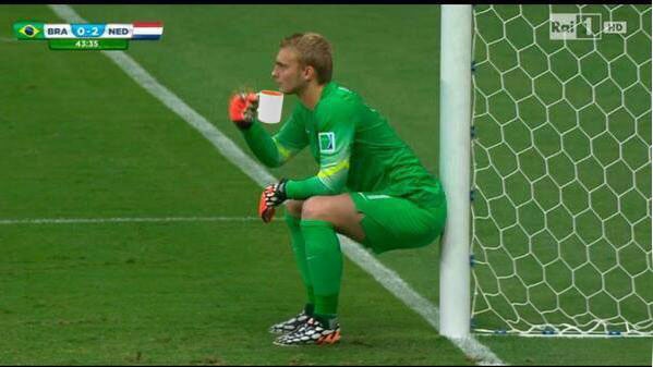 | Thủ môn Cillessen nhâm nhi cafe xem đồng đội hạ sát Selecao. |
