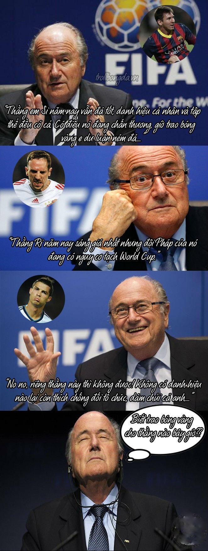 | Cuộc đua giành Quả bóng vàng FIFA 2013 hứa hẹn sẽ rất hấp dẫn bởi Ribery, Messi và Ronaldo đều có điểm mạnh và yếu riêng. |