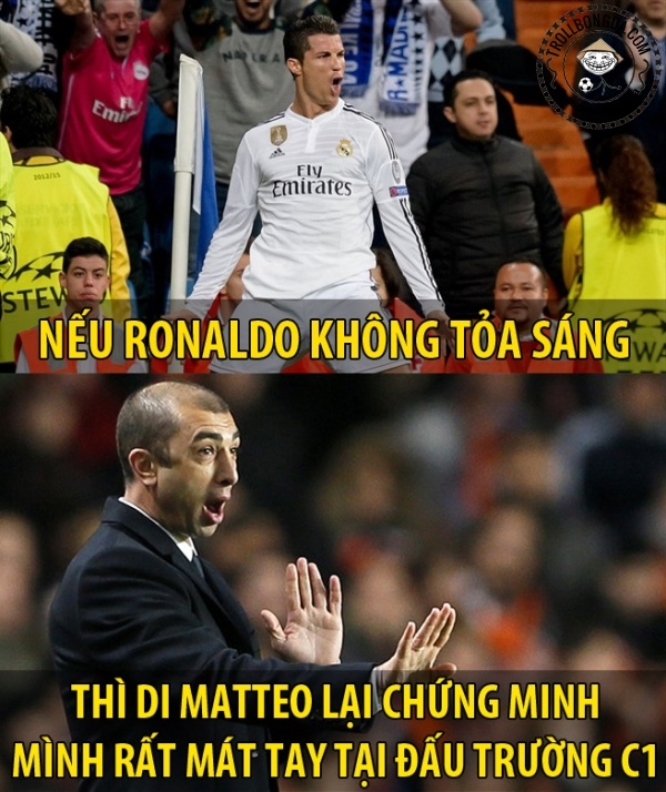 | Số phận của "Kền kền trắng" có lẽ đã được định đoạt nếu Ronaldo không kịp tỏa sáng với cú đúp bàn thắng bằng đầu. Trong khi HLV Di Matteo cho thấy ông không dễ bị đánh bại tại đấu trường châu Âu. Mùa 2011/12, chiến lược gia người Italy từng giúp Chelsea hạ gục Bayern Munich trong trận chung kết diễn ra ngay tại sào huyệt Allianz Arena. |