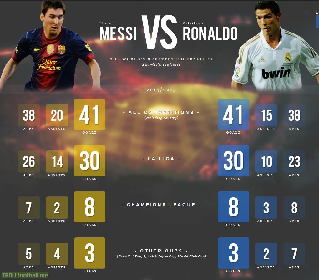 Với cú đúp vào lưới Schalke, Ronaldo đã quân bình thành tích 41 bàn của Messi mùa này. Giữa hai siêu sao này có sự trùng hợp khi cùng ghi 30 bàn tại La Liga, 8 bàn tại Champions League và 3 bàn ở những sân chơi khác.