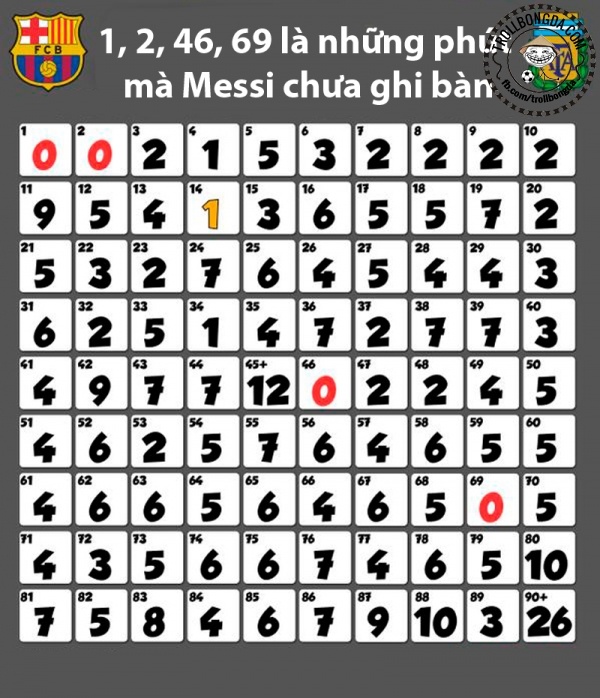 | Bàn thắng của Messi vào lưới Sevilla diễn ra ở phút 14. Theo đó siêu sao người Argentina chỉ còn 4 phút chưa ghi bàn trong trận đấu là 1, 2, 46 và 69. |