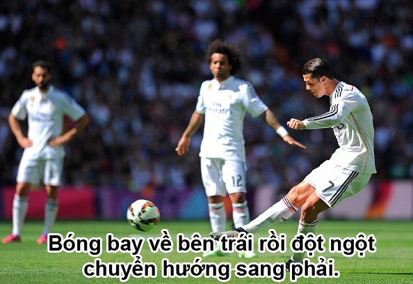 | Cú sút của Ronaldo đưa bóng đi khó lường. Bóng đi hơi liệng về bên trái rồi đập đất và đổi hướng khiến thủ môn Xabier không kịp truy cản. |