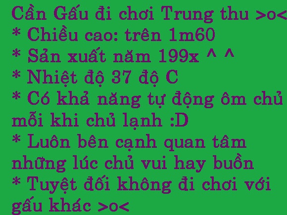 Nhịp sống Cười Ảnh chế vui về FA trong ngày Trung thu Thứ tư, 18/9/2013 18:00 (GMT+7) 18:00 18/9/2013 Những bức ảnh vui về Trung thu chắc chắn sẽ khiến bạn cười nghiêng ngả. Theo Báo Đất Việt ảnh vui Trung thu ảnh vui Trung thu Đọc tiếp Em ở đâu anh phi trâu đến đón 18:00 17/9/2013 18:00 17/9/2013 3 -3 3 Cùng cười với những hình ảnh "Đằng sau một bức ảnh nghệ thuật là cả đội ngũ kỹ thuật nhiệt tình", "Người yêu có thể không có nhưng chó phải nuôi một con"... Những hình ảnh hài hước trong ngày 09:07 18/9/2013 09:07 18/9/2013 1 1 Trung thu cho FA, lần đầu đi tiêm, đi xe bus phong cách 2013, ảnh khó đỡ của con gái... là những hình ảnh hài hước không thể bỏ qua. Ảnh động: Võ nghệ cao cường 08:58 18/9/2013 08:58 18/9/2013 0 Bé trai có màn đấu võ đẹp mắt với quái vật nhồi bông. Bạn có thể quan tâm