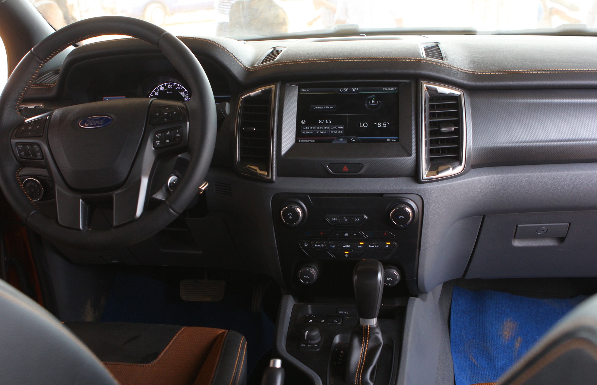 | Bên trong nội thất, phiên bản Wildtrak vẫn duy trì phong cách thiết kế đặc trưng với chất liệu da, nỉ kết hợp cùng các đường kẻ chỉ. Vô-lăng 4 chấu đa chức năng. |
