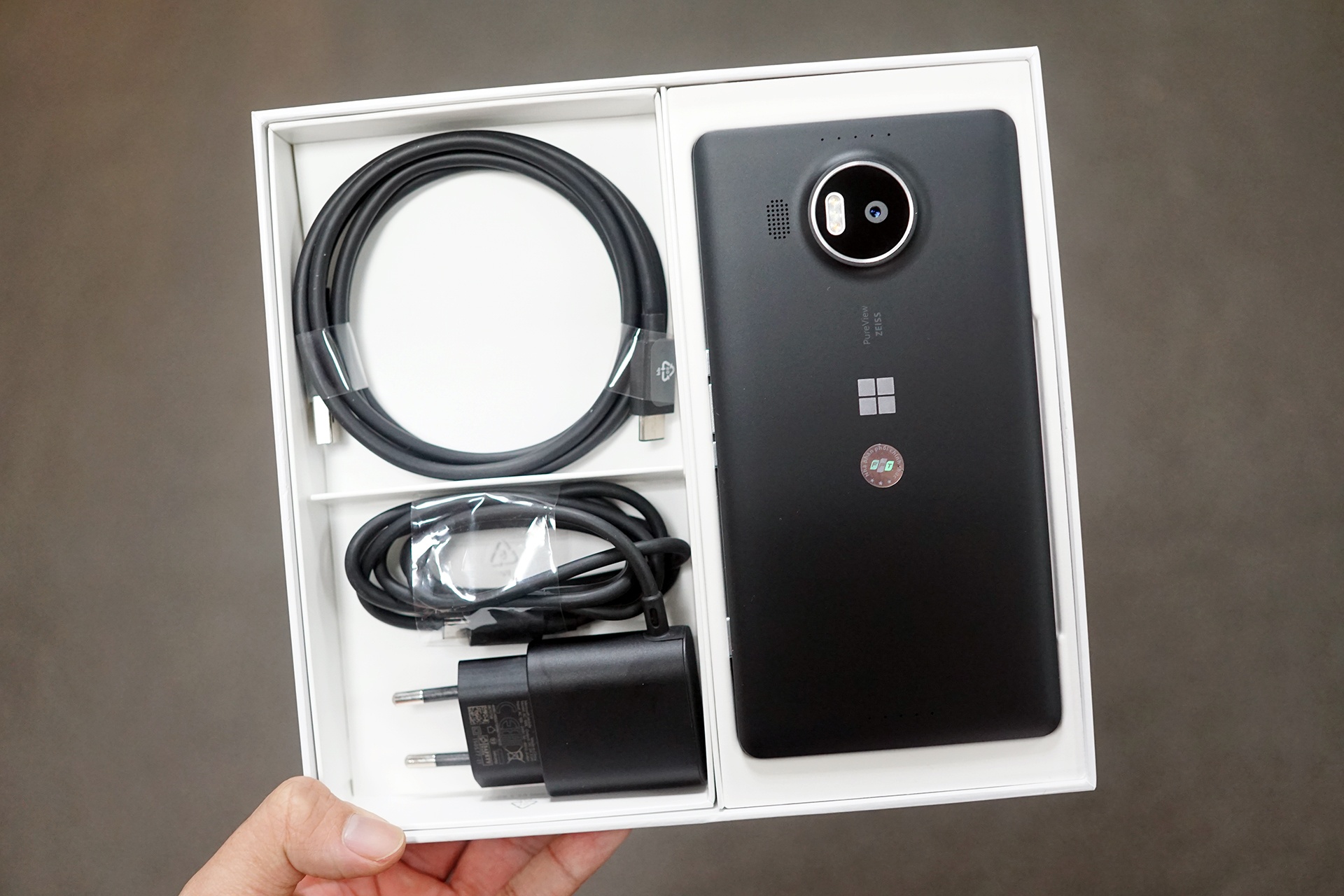 | Tương tự những chiếc Lumia cao cấp trước đây, 950 XL được đựng trong hộp vuông dạng dẹt nhưng kích thước khá lớn. Phụ kiện đi kèm gồm cục sạc nhanh, dây cáp USB-C và không có tai nghe đi kèm. |
