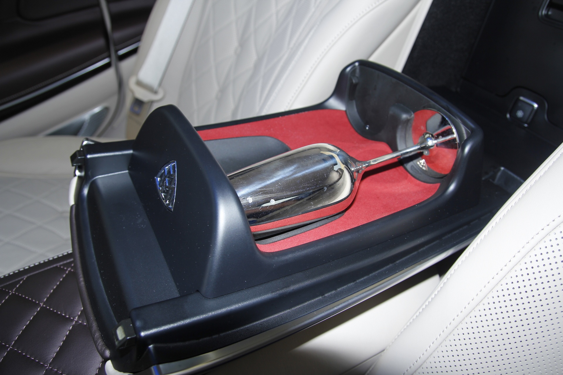 | Ngoài ra, không thể không kể đến hai chiếc ly champagne bằng bạc được chế tác thủ công bởi Robbe & Berking. Hành khách có thể thoải mái hạ lưng sau ghế, nghe những bản nhạc du dương và thưởng thức champagne trên hành trình của mình. Chiếc xe này cũng được trang bị những công nghệ đầu bảng như hệ thống Air-Balance với bộ lọc không khí cao cấp, chức năng ion hóa oxy để tăng sự dễ chịu. Ngoài ra, xe được trang bị nước hoa trầm hương hiệu Agargood. Đây là loại nước hoa được chiết xuất từ trầm hương, có giá trị mỗi gram đắt hơn vàng. |