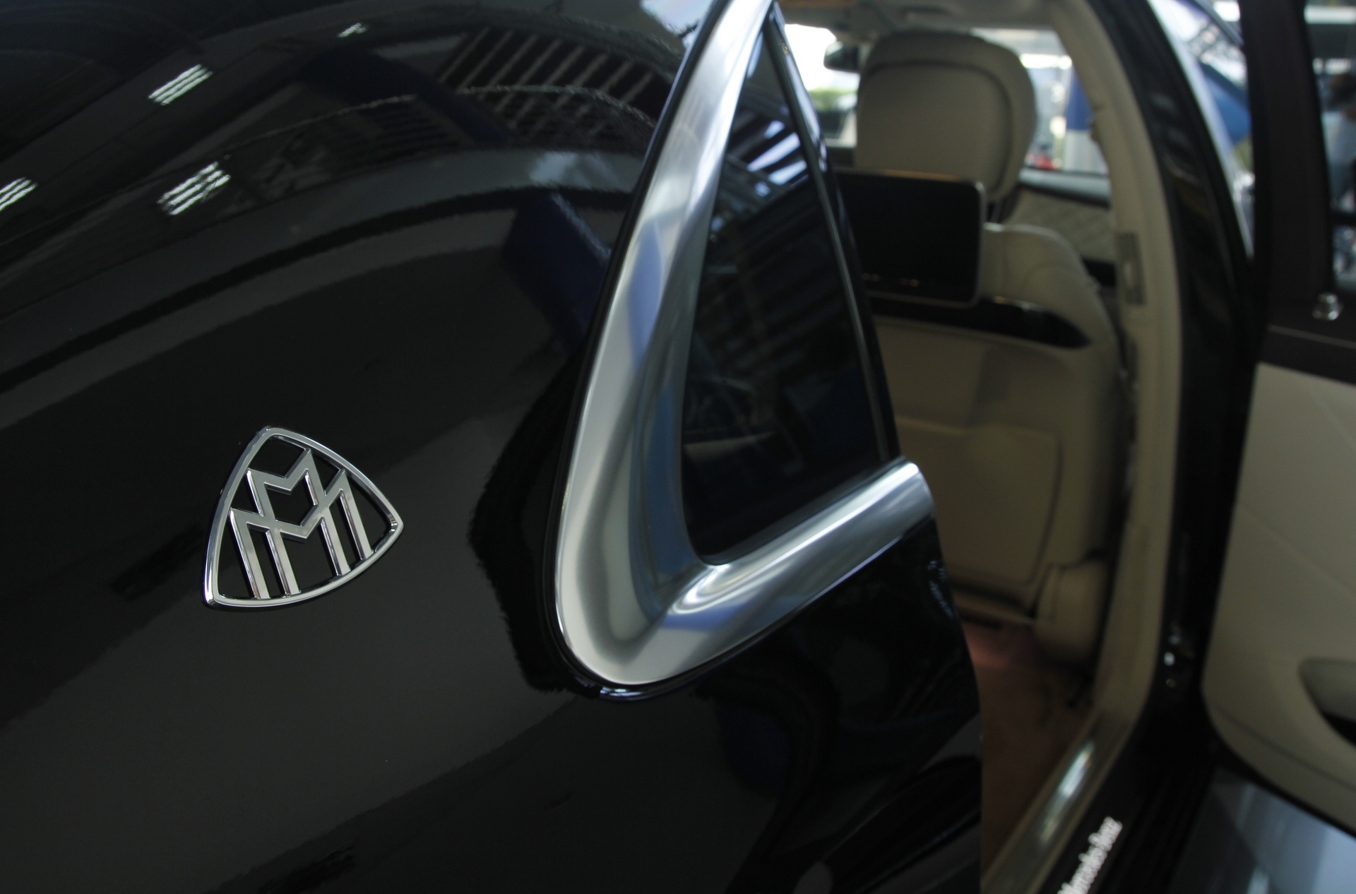 | Logo hai chữ M đan vào nhau trên xe siêu sang Maybach đã được gắn ở trụ C, phía sau đính chữ Maybach đối xứng với S600 qua logo ngôi sao 3 cánh. |