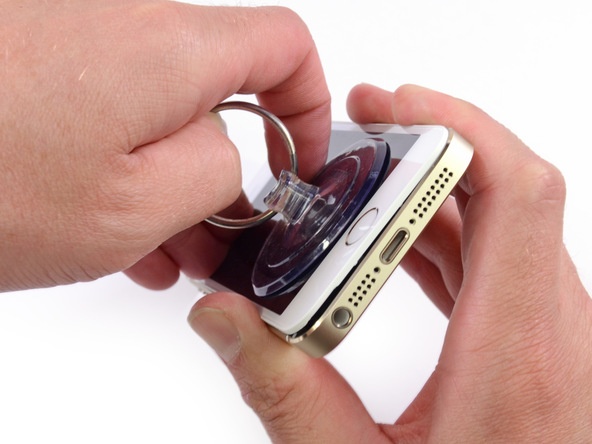 | Chuyên gia của iFixit dùng dụng cụ áp lên mặt trước của iPhone để tách lớp trên. |