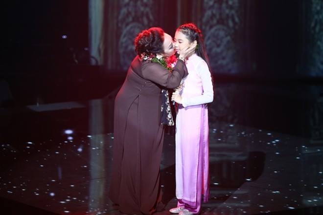 | NSND Ngọc Giàu thể hiện khúc Dạ cổ hoài lang trên sân khấu. Ngay khi bà kết thúc phần trình diễn, Phương Mỹ Chi đã xuất hiện để tặng hoa nữ danh ca. Nghệ sĩ không kiềm được niềm xúc động nên đã ôm chầm lấy "chị Bảy" và hôn lên má cô bé. |