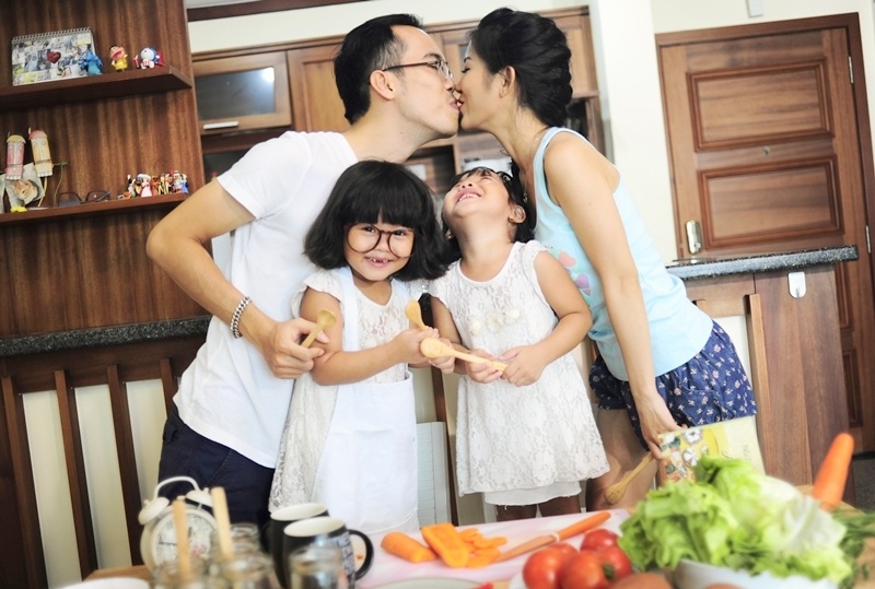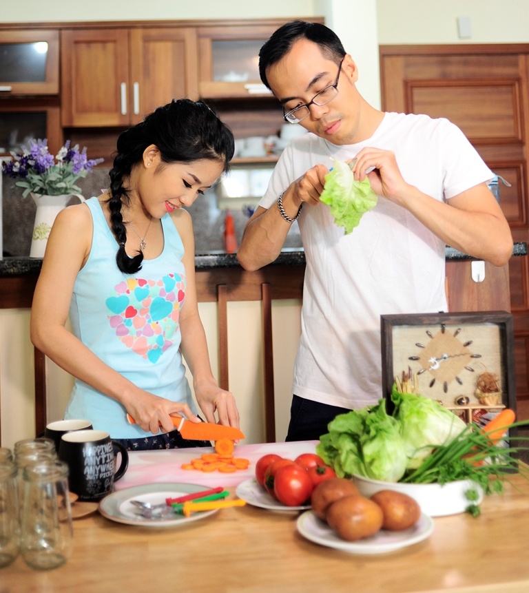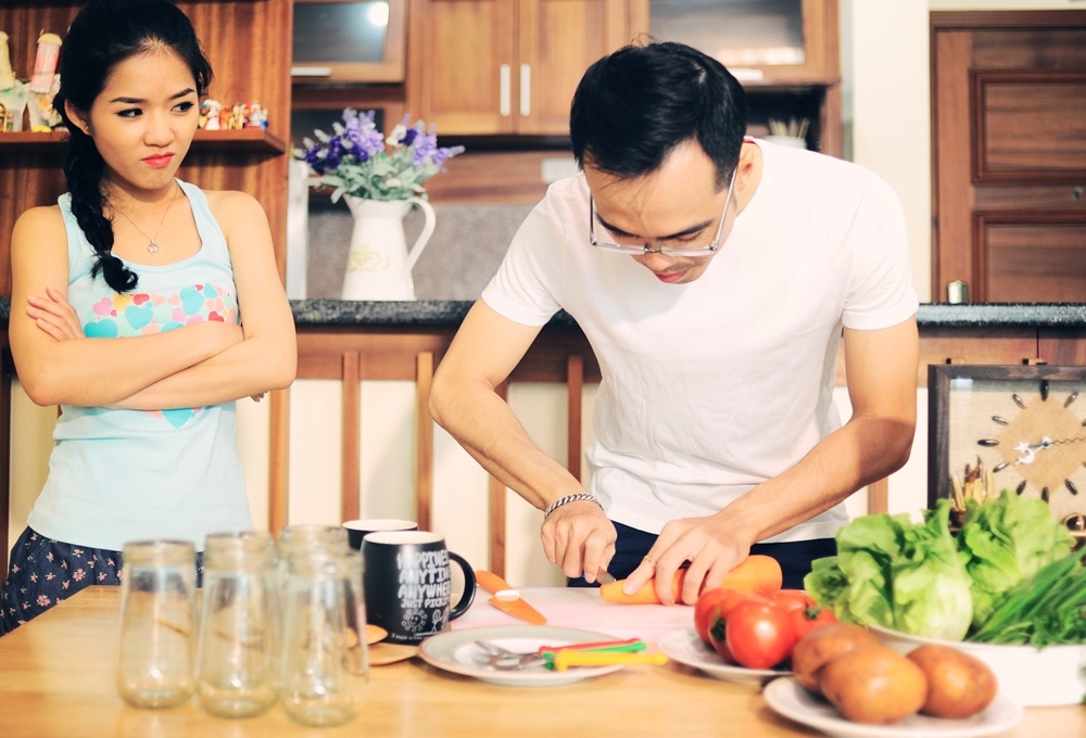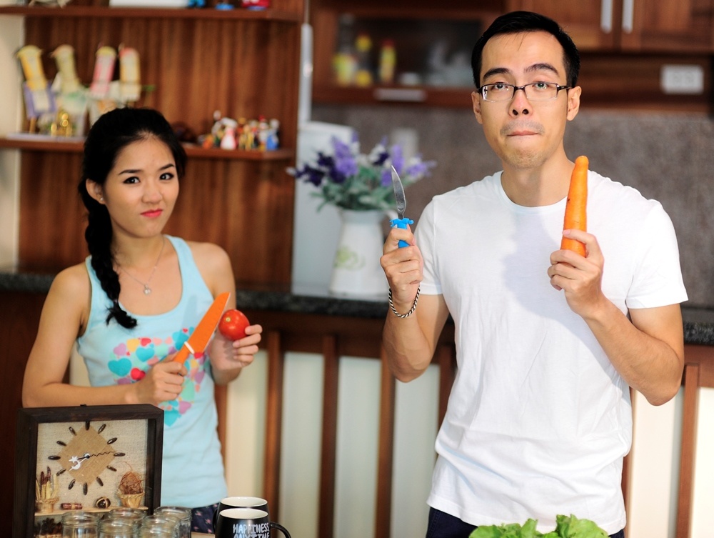 | Nụ hôn ngọt ngào trong phòng bếp của đôi tình nhân. Ngày tháng yêu nhau của cặp đôi này cũng gặp nhiều trắc trở do ở xa. Tuy nhiên, Tuấn vẫn thường xuyên vào thăm Duyên và đi du lịch. Cô gái này cũng luôn biết chăm sóc người yêu bằng những bữa ăn tận tay nấu và tặng anh nhiều món quà tự làm.