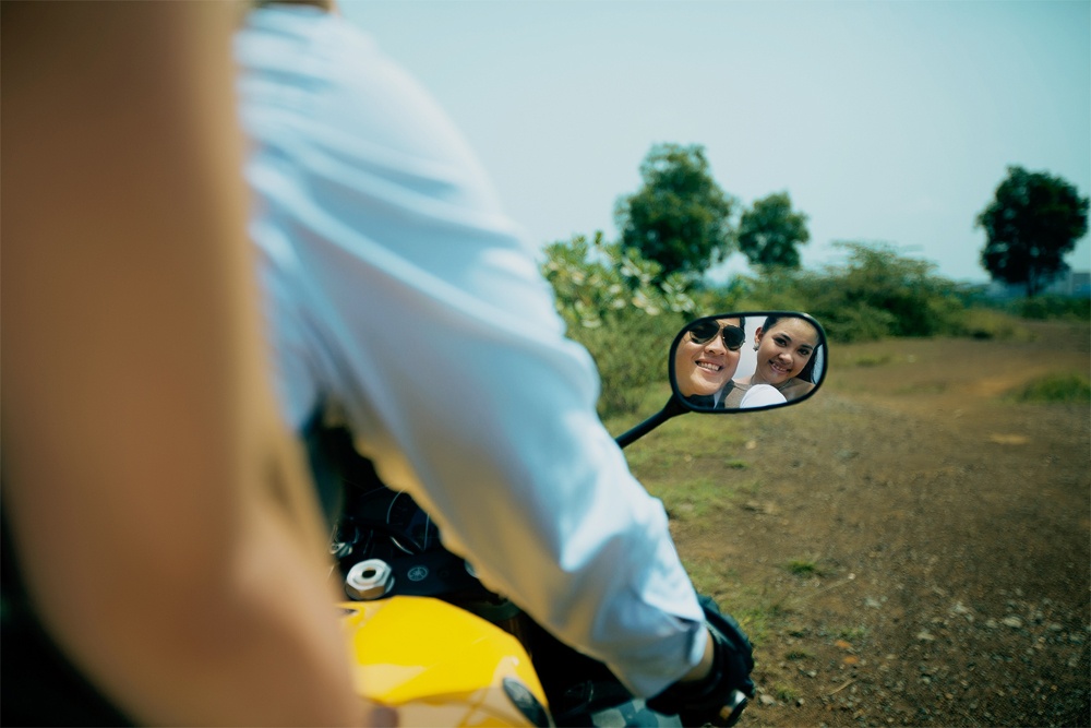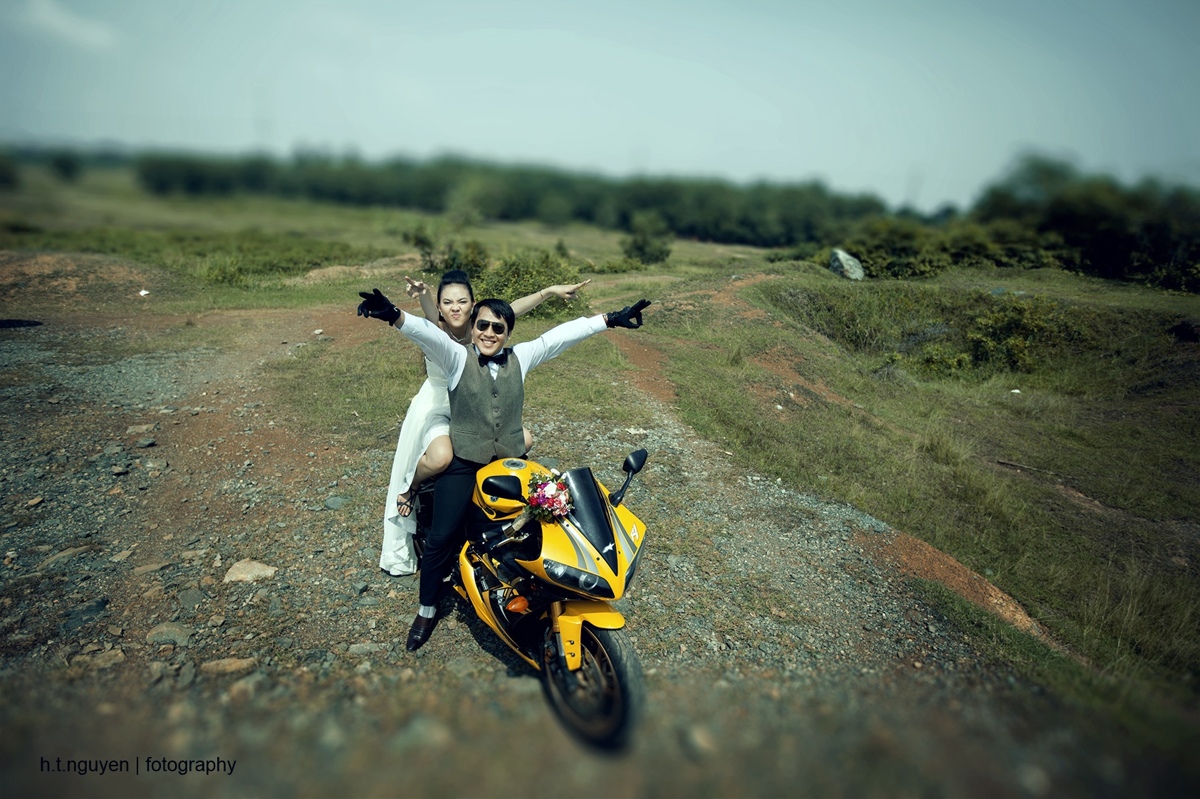 Theo dự định ban đầu, cô dâu chú rể mỗi người sẽ cưỡi một chiếc nhưng vì kích thước xe quá lớn, nếu xuất hiện riêng biệt sẽ khó tạo cho người xem cảm giác gắn kết. Vì thế, cặp đôi quyết định sẽ chỉ dùng một mô tô cho bộ ảnh cưới.