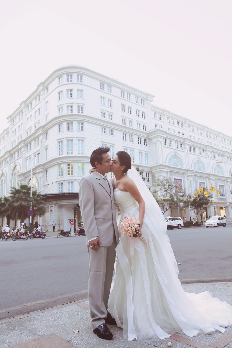 Bộ ảnh cưới của chị gái Hoàng My và chồng doanh nhân được thực hiện tại những địa danh nổi tiếng ở TP.HCM. Cô dâu hạnh phúc trong trang phục váy cưới tông trắng trong trẻo.