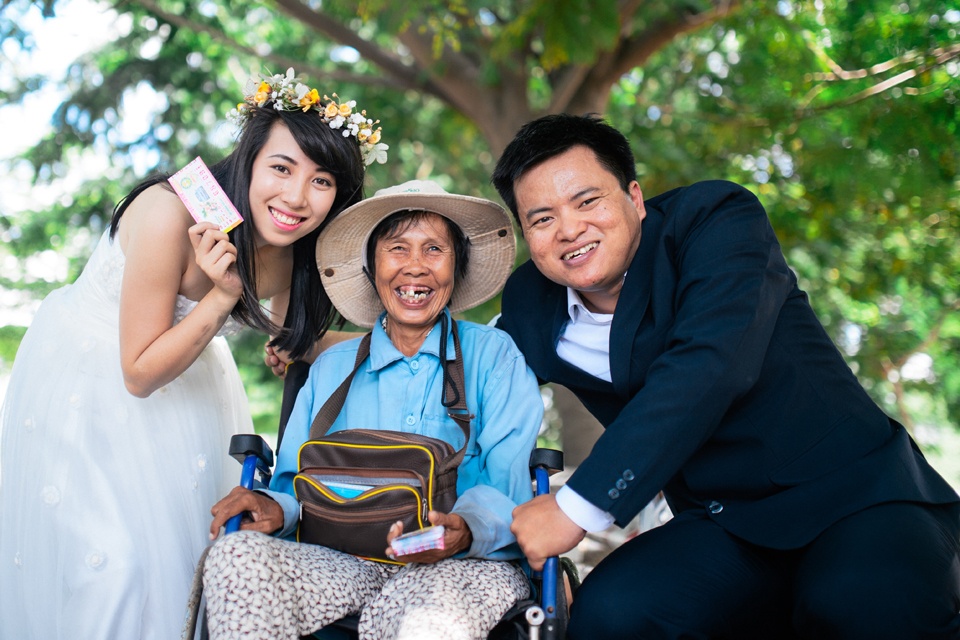 | Chủ nhân của nhiều bộ ảnh cưới dễ thương, quậy tưng bừng theo phong cách tự nhiên cùng cô dâu của mình chụp ảnh cùng người bán vé số. |