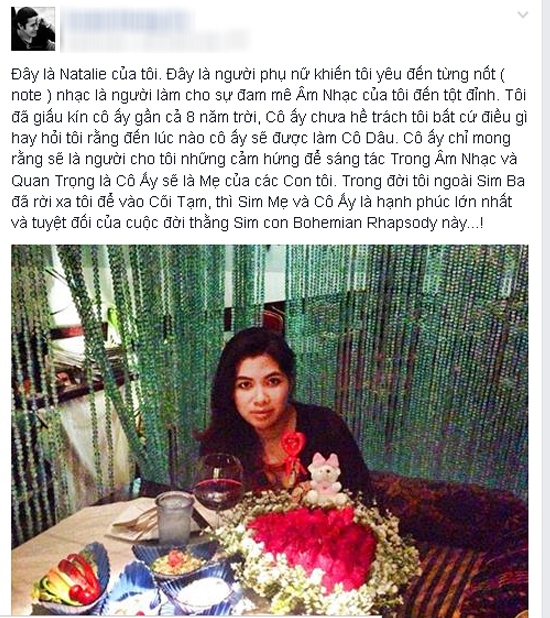 Cô ấy chỉ mong rằng sẽ là người cho tôi những cảm hứng để sáng tác trong âm nhạc và quan trọng là cô ấy sẽ là mẹ của các con tôi. Trong đời tôi ngoài Sim ba đã rời xa tôi để vào cõi tạm, thì Sim mẹ và cô ấy là hạnh phúc lớn nhất và tuyệt đối của cuộc đời thằng Sim ...!".