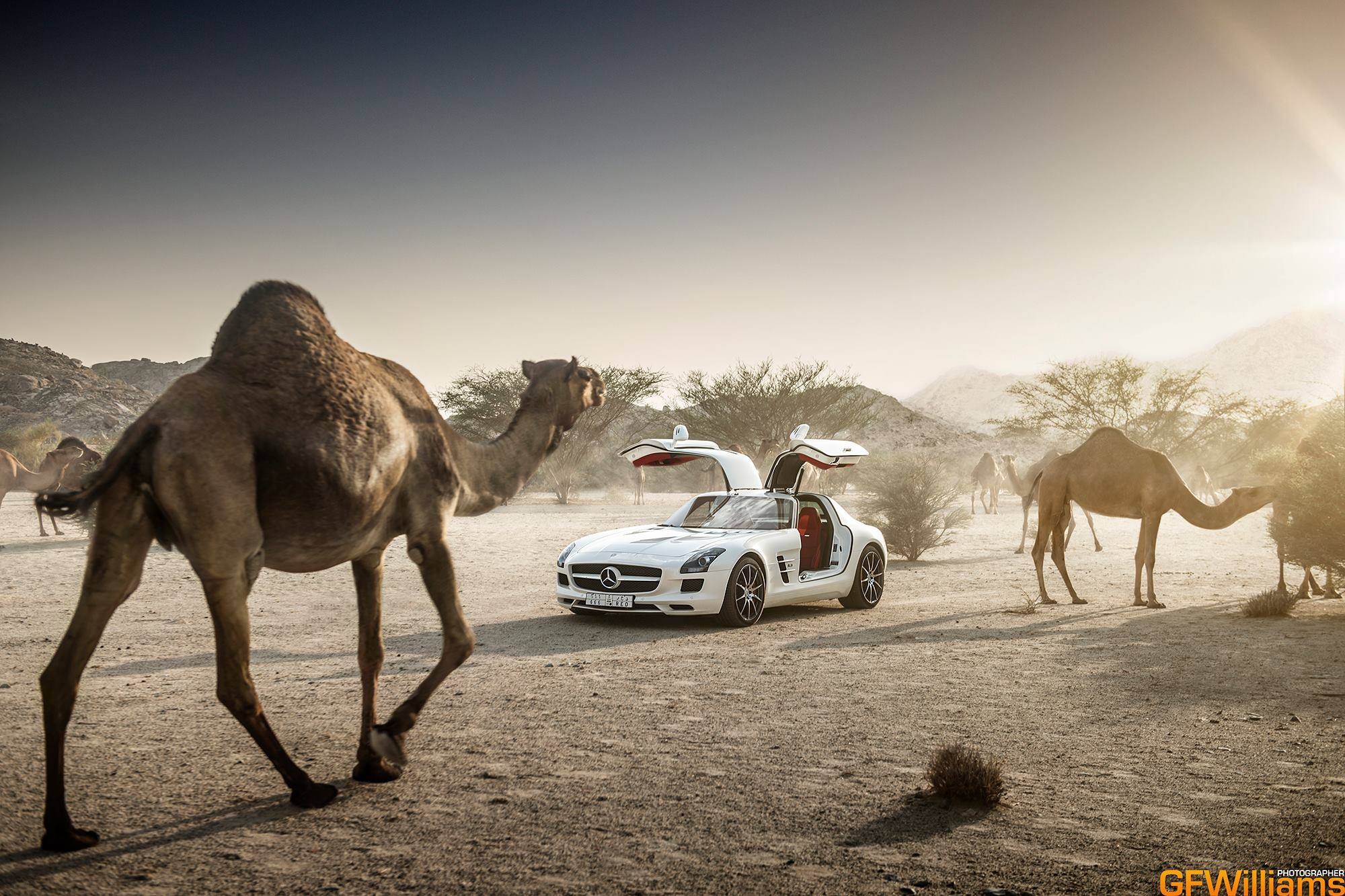 | Siêu xe Mercedes-Benz SLS AMG giữa một đàn lạc đà. Ảnh: GFWilliams. |