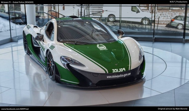 McLaren P1 phong cách cảnh sát Dubai. Siêu xe được trang bị động cơ V8, dung tích 3,8 lít công suất 727 mã lực kết hợp một motor điện sản sinh công suất tổng 903 mã lực, cho tốc độ tối đa 350 km/h.