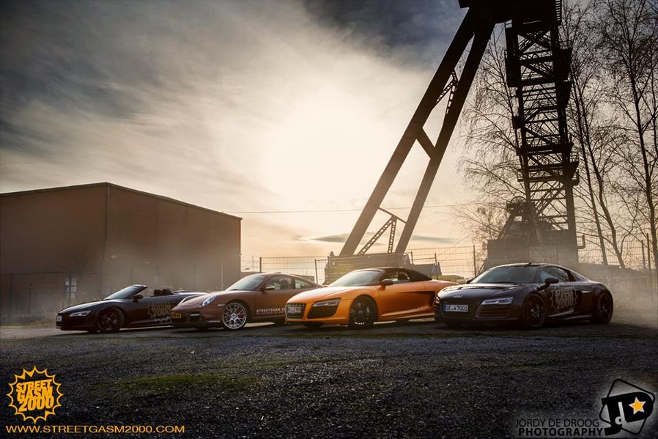 | 4 mẫu siêu xe xếp hàng ngang theo thứ tự từ trái sang phải lần lượt là Audi R8 V10 Spyder, Porsche 911 Turbo, Audi R8 V10 Spyder và Audi R8 V10. |