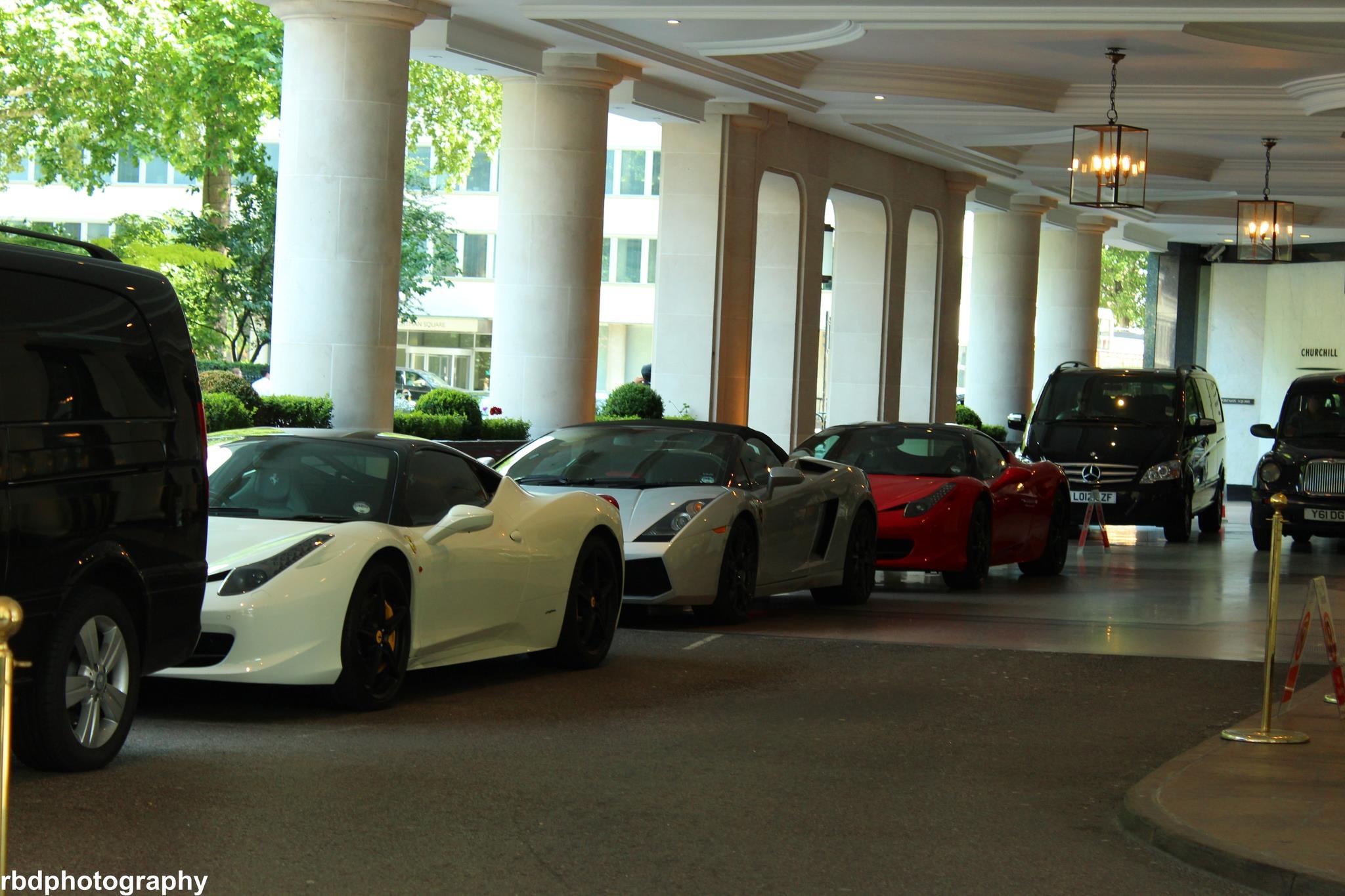 | Bộ ba siêu xe Ferrari 458 Italia và Lamborghini Gallardor tại một khách sạn ở London. Ảnh: rbd. |