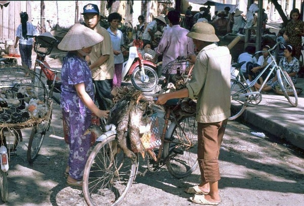 | Chợ cóc những năm 1991 rất phổ biến ở Hà Nội. Người ta có thể mang đủ thứ ra chợ bán rong, từ gia cầm gà vịt tới hoa quả, thịt cá. |