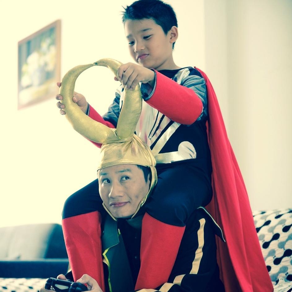 | Theo chia sẻ của Hoàng Bách, khác với vẻ ngoài hiền lành, Tê Giác ẩn chứa bên trong một cá tính rất dữ dội và hiếu thắng. Tuy nhiên, vì đó là một phần trong cá tính của con, Hoàng Bách muốn bé thể hiện ra để có cơ hội cùng con thay đổi hoặc ít nhất kiểm soát theo cách hợp lý hơn. Trong hình, "cậu bé biết tuốt" chụp ảnh thân thiết với em gái. |