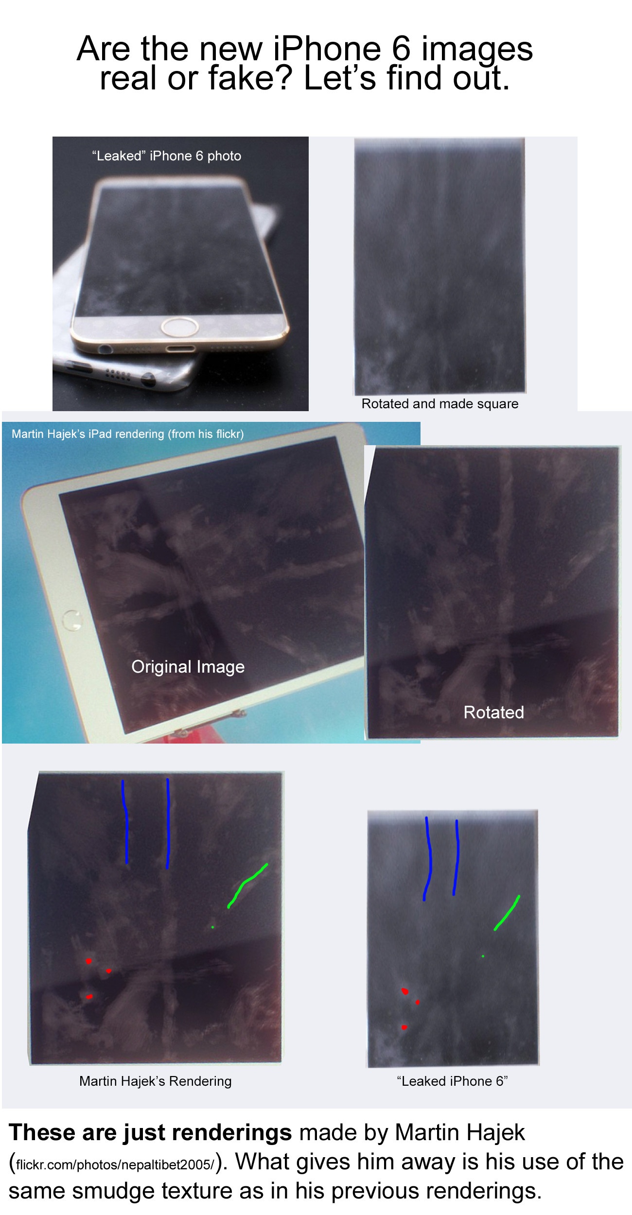 Theo đồ họa của PhoneArena, các chi tiết bên trên màn hình đã chứng minh sử giả mạo này. Theo đó, các bức ảnh đã sử dụng lại hình ảnh rò rỉ iPad trước đây của Martin Hajek để mô phỏng bản iPhone 6 mới.