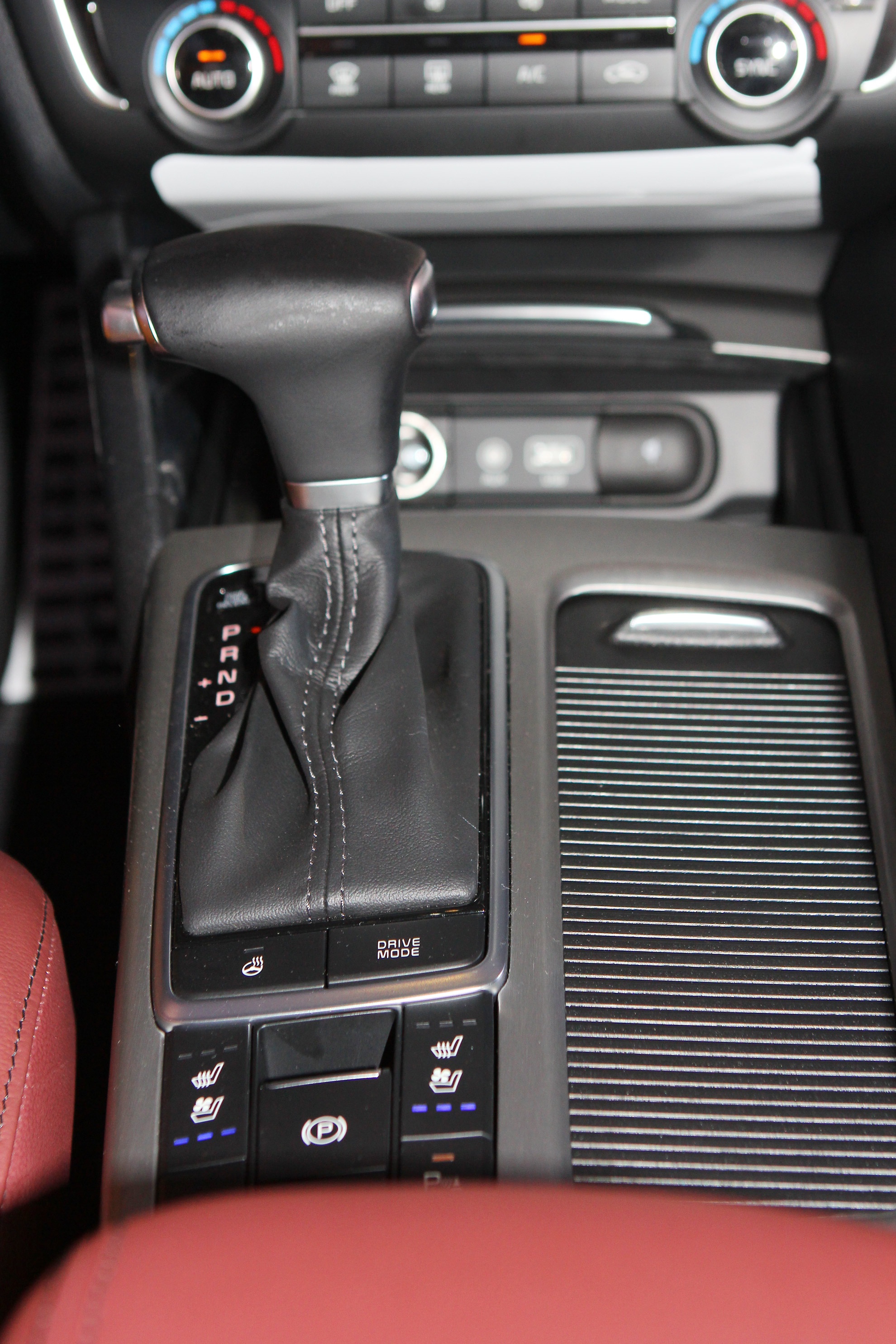 | Cần số bọc da với các đường viền thiết kế như trên những mẫu xe cao cấp. Các chế độ lái và nút bấm phanh tay điện tử cũng được tích hợp. |