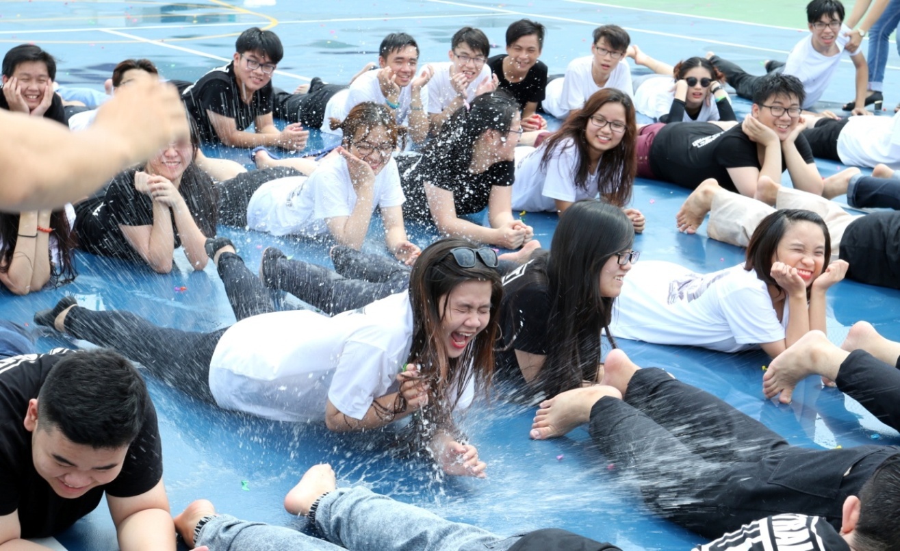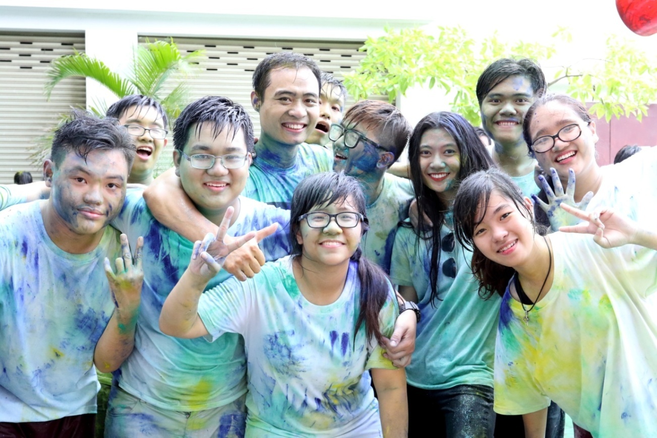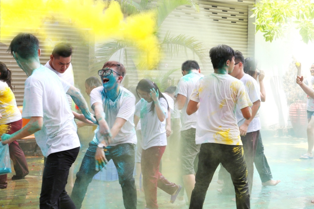 | Thầy và trò Quốc tế Á Châu tham gia trò chơi ném bột màu để ghi lại những khoảnh khắc đáng nhớ. |