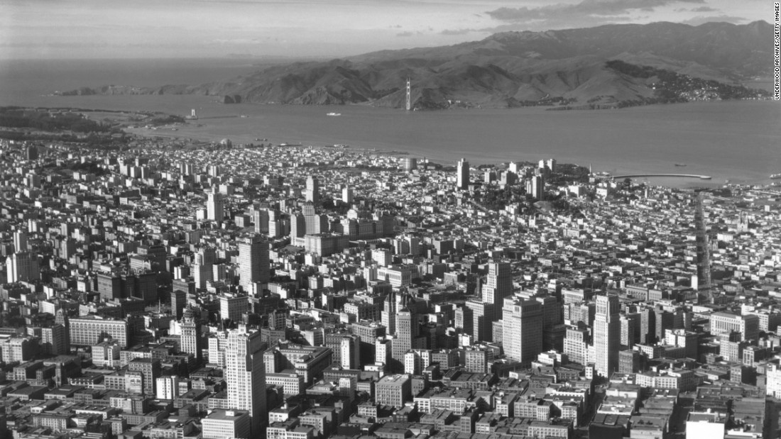 Cảnh tượng vào năm 1934, khi công nhân đang xây cầu Cổng Vàng. Một trong hai tháp treo của nó sắp hoàn thiện. Trước khi cầu ra đời, người dân phải dùng phà để di chuyển giữa hai bờ. Ảnh: Getty |