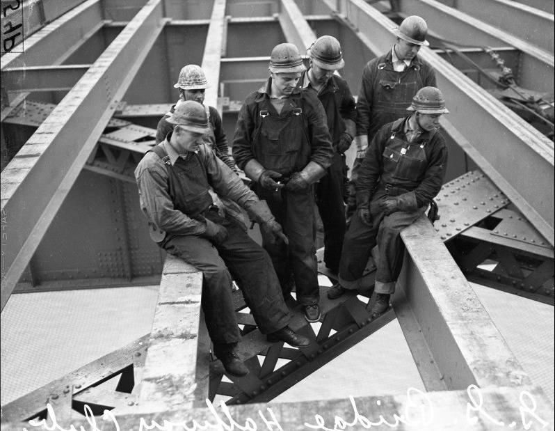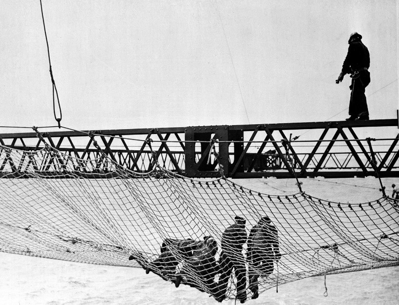 Đội xây cầu ngồi trên các thanh dầm lớn. Tuy nhà thầu áp dụng các biện pháp bảo hộ nhưng 11 người đã chết trong quá trình xây dựng cầu. 10 người trong số họ rơi lọt qua tấm lưới bảo vệ phía dưới. Ảnh: Corbis |