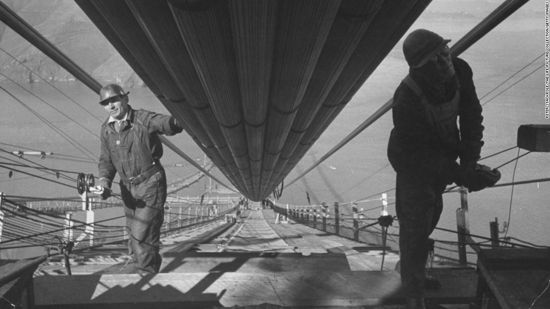Công nhân xây dựng trên sợi cáp chính của cầu. Họ làm việc ở vị trí cao, gió mạnh nên rất nguy hiểm. Ảnh: Corbis |