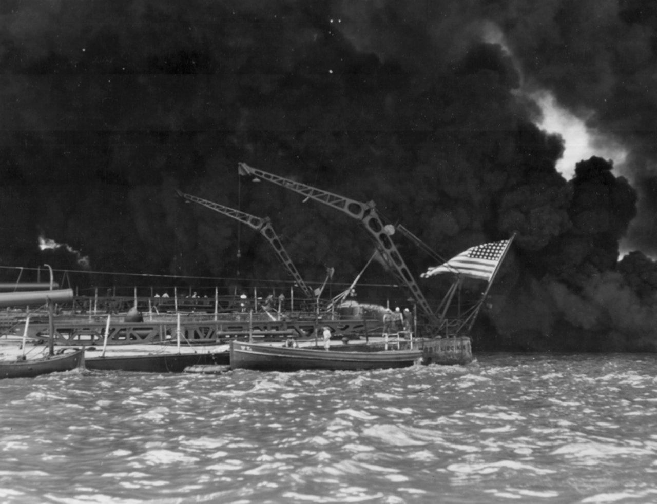 Bất chấp nguy hiểm, một tàu hỗ trợ cố gắng tiếp cận USS West Virginia đang cháy. Nó trúng đạn ở khu neo đậu ngay phía trước tàu USS Arizona và bên cạnh tàu USS Tennessee. Do đậu ở ngoài cùng nên USS West Virginia hứng 9 quả ngư lôi và 2 quả bom khiến 106 thành viên thủy thủ đoàn thiệt mạng. |