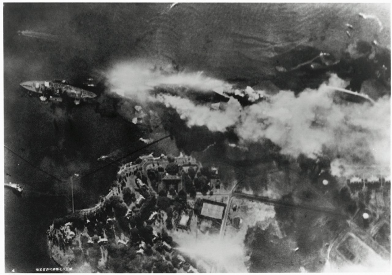 Cảnh tượng Trân Châu Cảng từ máy bay Nhật cho thấy chiến hạm USS West Virginia trúng ngư lôi. Phát xít Nhật tấn công bất ngờ khiến Mỹ không kịp trở tay và hứng chịu thiệt hại nặng nề. Thất bại đau đớn ấy khiến Washington tham gia Thế chiến II bằng cách tuyên chiến với Nhật Bản, Đức và Italy. |