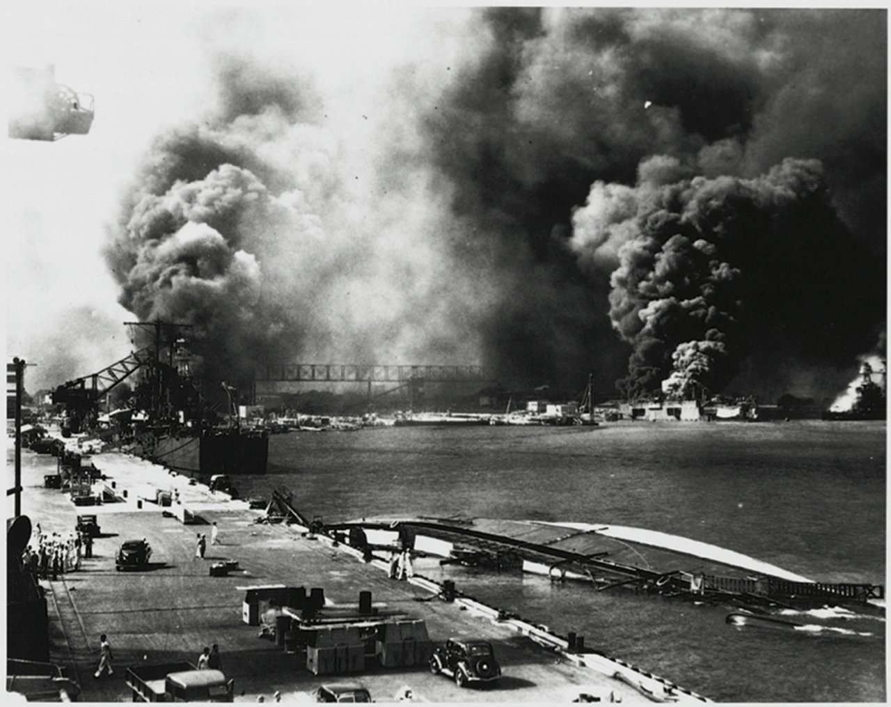 Khói bốc lên từ tàu USS Arizona trong khi quốc kỳ Mỹ đang bay trên nóc tàu USS Virginia đã chìm. Vụ tấn công làm 2.403 lính Mỹ thiệt mạng và 1.178 người khác bị thương. Hải quân Mỹ mất hàng trăm máy bay cùng nhiều chiến hạm trong trận đánh lịch sử. |