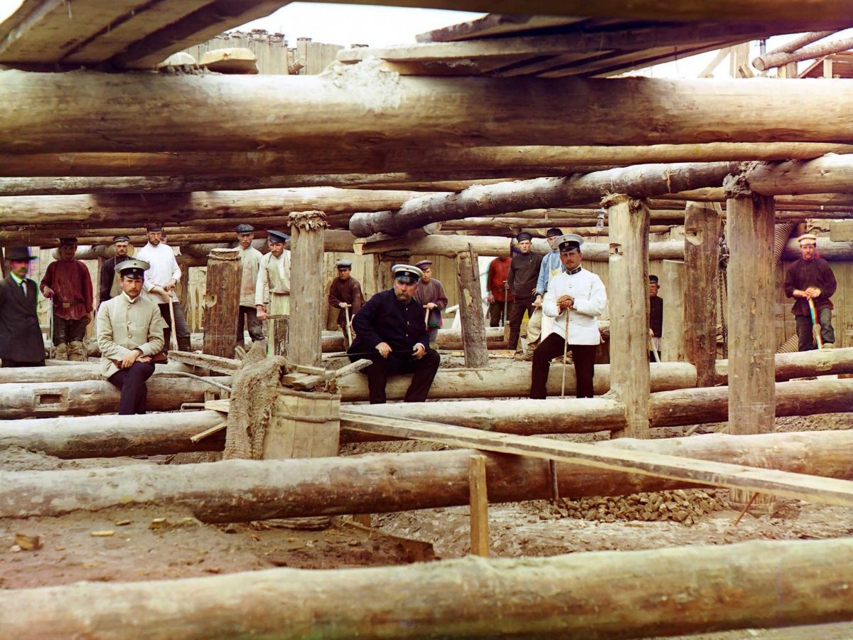 Nhiếp ảnh gia Prokudin-Gorskii (ngồi ngoài cùng bên phải) trên xe kéo di chuyển trên đường tàu Murmask do Nga xây dựng trong giai đoạn Thế chiến I. Nó kết nối thành phố Petrograd (Saint Petersburg ngày nay) với Murmask, thành phố cuối cùng được hình thành trong những năm đế chế Nga cai trị.