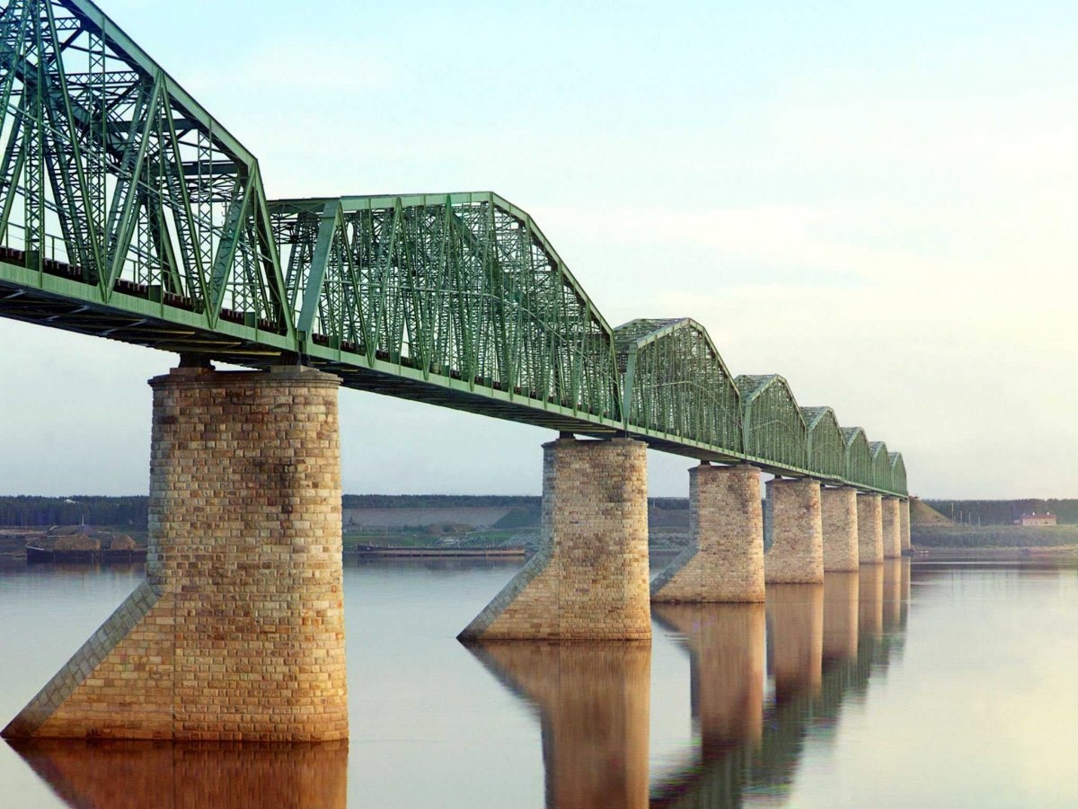 Đường tàu trên cây cầu bắc ngang sông Kama, gần thành phố Perm, một phần của tuyến đường sắt xuyên Siberia trải dài 9.600 m từ miền trung Nga tới Thái Bình Dương.