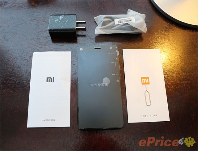 Phụ kiện đi kèm với máy khá đơn giản, bao gồm sách hướng dẫn, sạc, cáp và que chọc SIM. Hộp đựng Mi4 không đi kèm tai nghe.