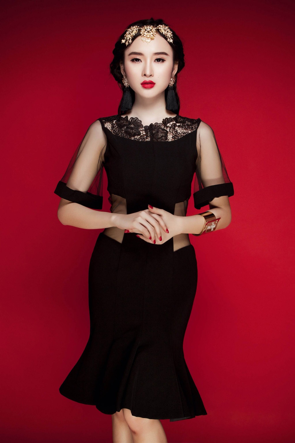 Đi kèm trang phục kiêu sa là mẫu phụ kiện đính hạt, dát vàng hợp xu hướng. Phụ kiện góp phần tạo điểm nhấn nổi bật trên nền trang phục tối màu.