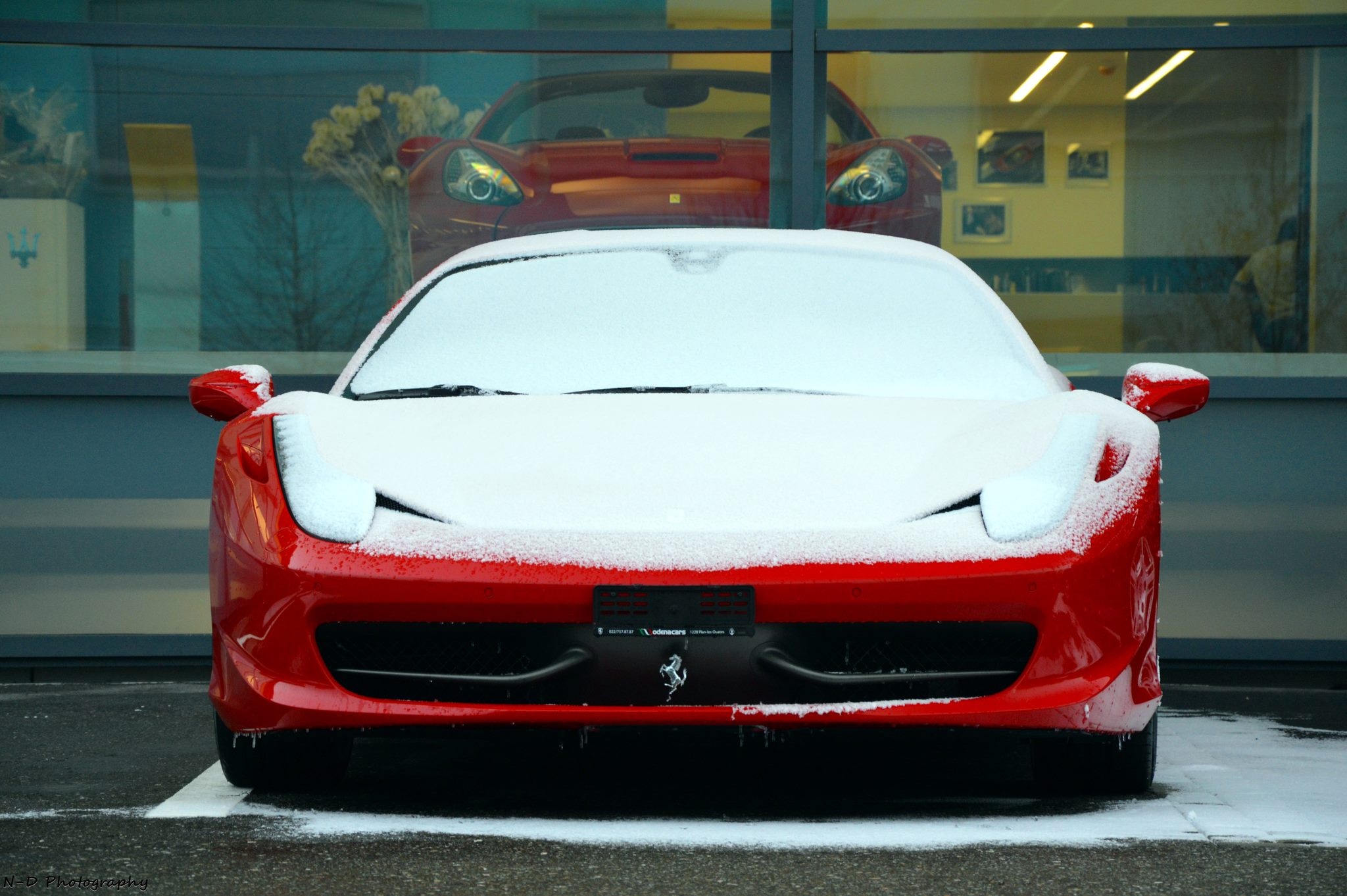 | Siêu xe Ferrari 458 Italia phủ tuyết tuyệt đẹp trên đường phố. Ảnh: N-D Photography. |