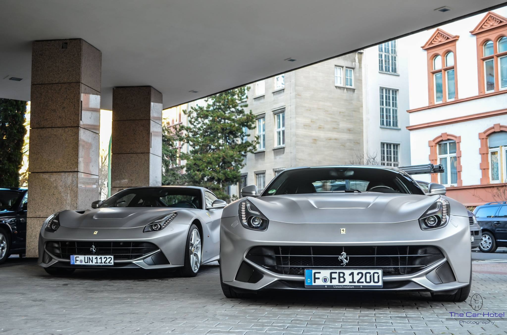 | Cặp siêu xe Ferrari F12 Berlinetta màu bạc nhám tại Frankfurt. Ferrari F12 Berlinetta hiện là siêu xe mạnh thứ 2 của Ferrari sau siêu xe hybrid LaFerrari. F12 Berlinetta có sức mạnh 731 mã lực. Ảnh: Thecarhotel. |
