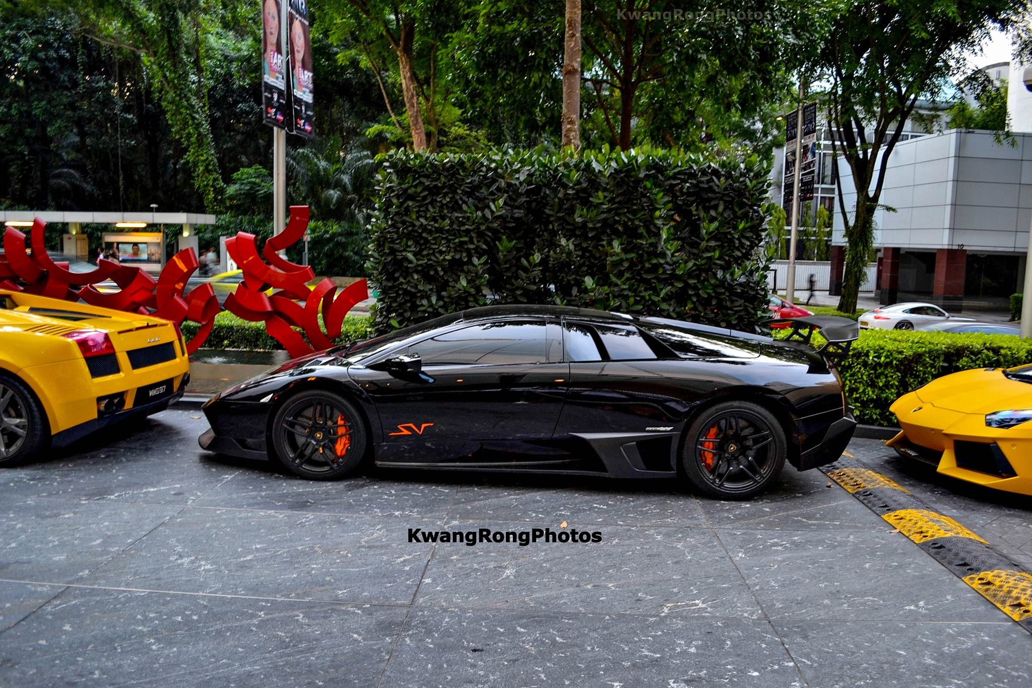 | Bộ 3 siêu xe Lamborghini Gallardo, Murcielago LP670-4 Superveloce và Aventador tại một bãi để xe. Siêu xe Murcielago LP670-4 Superveloce màu đen sở hữu động cơ V12 6,5 lít, công suất 661 mã lực tại 8.000 vòng/phút và mô-men xoắn cực đại 660 Nm tại 6.500 vòng/phút, có khả năng tăng tốc 0-100 km/h trong 2,9 giây và đạt vận tốc tối đa 336 km/h. Ảnh: Ng Kwang Rong. |