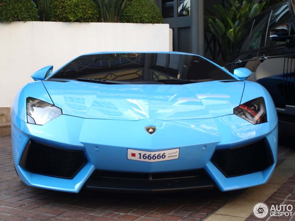 | Lamborghini Aventador LP700-4 màu xanh da trời biển số Bahrain xuất hiện ở Cannes, Pháp. |