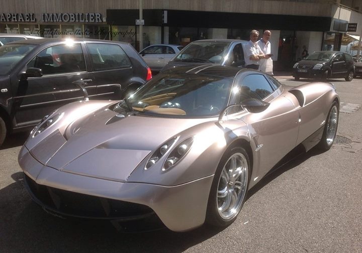 Pagani Huayra màu xám của đại gia Qatar xuất hiện ở Cannes, Pháp. Siêu xe được mệnh danh là "thần gió", ra mắt năm 2012, trang bị động cơ V12 công suất 720 mã lực và có giá bán đến 1,2 triệu USD.