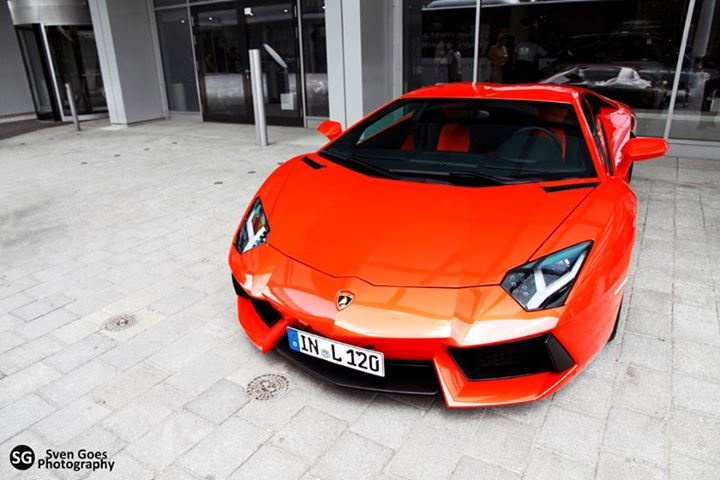 Lamborghini Aventador LP700-4 màu cam ở Audi Forum tại Ingolstadt, Đức. Lamborghini hiện thuộc sở hữu của tập đoàn Audi AG.