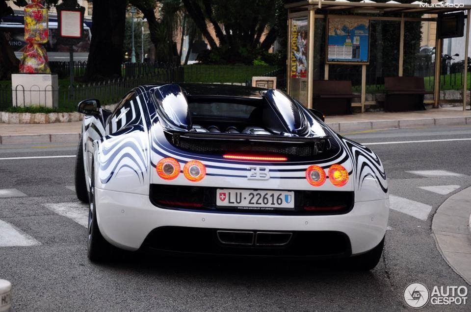 Bugatti Veyron Grand Sport Vitesse L'or Blanc ở Monaco. Phiên bản đặc biệt này có tên "vàng trắng", chỉ có một chiếc, nổi bật ở ngoại thất với màu trắng chủ đạo và những mảng màu xanh.