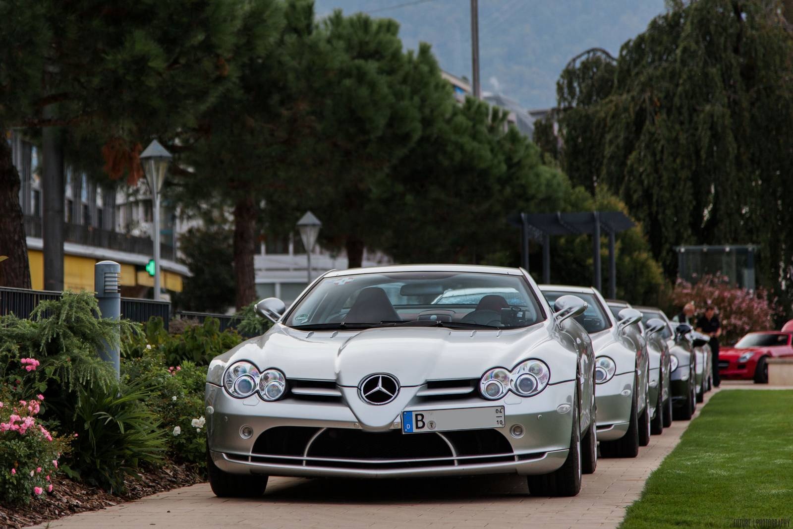 Dàn Mercedes-Benz SLR McLaren tụ họp ở Montreux, Thụy Sỹ. Mẫu siêu xe này được sản xuất từ 2003 đến 2010, được trang bị động cơ V8, dung tích 5,4 lít, hộp số tự động 5 cấp.