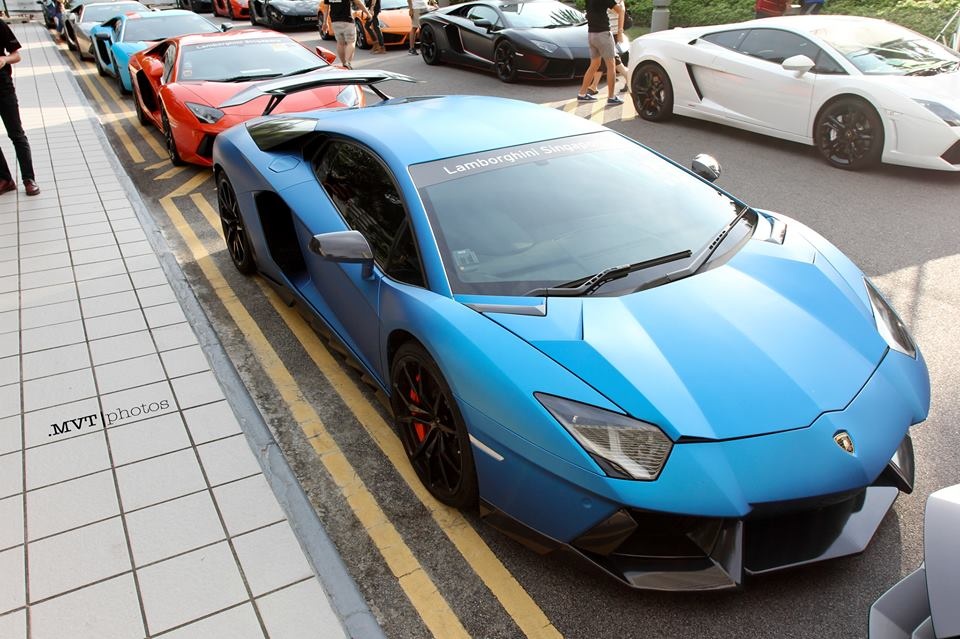 | Chiếc Lamborghini Aventador độ Novitec Torado được bao quanh bởi loạt Aventador và Gallardo. |