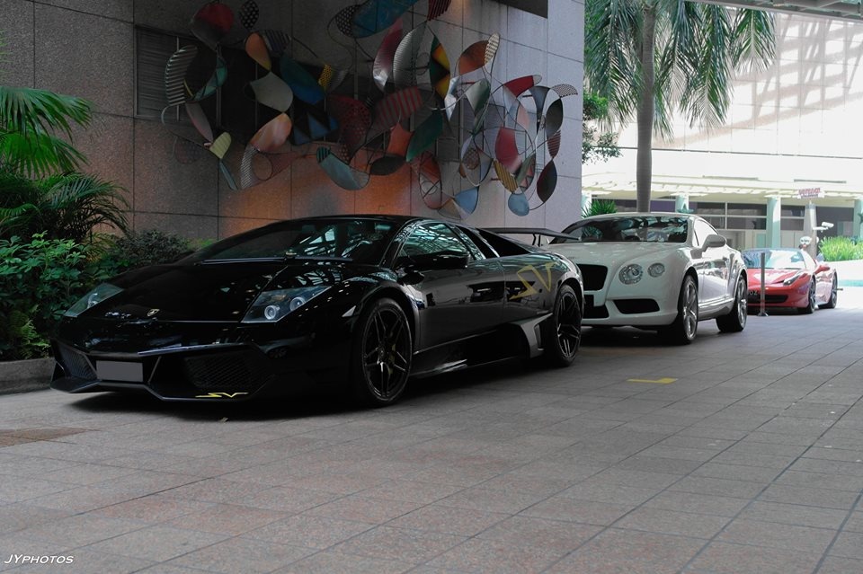 Chiếc Coupe Bentley bị kẹp giữa bởi bộ đôi siêu xe Lamborghini Murcielago LP670-4 SV và Ferrari 458 Italia.